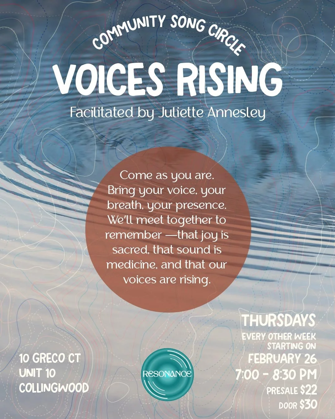 Come as you are. Voices Rising is a gentle, joy-filled song circle led by Juliette Annesley. We’ll connect, soften, and remember that sound is medicine—no experience needed, just your presence and a willingness to sing. Leave lighter, tuned, and connected.