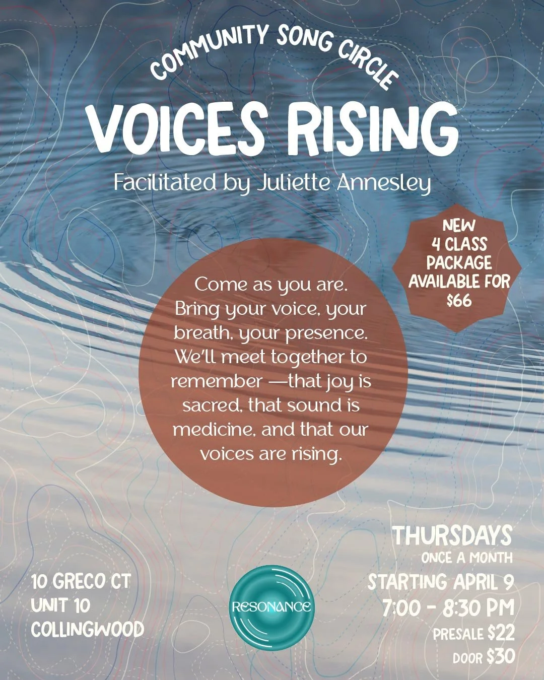 Come as you are. Voices Rising is a gentle, joy-filled song circle led by Juliette Annesley. We’ll connect, soften, and remember that sound is medicine—no experience needed, just your presence and a willingness to sing. Leave lighter, tuned, and connected.