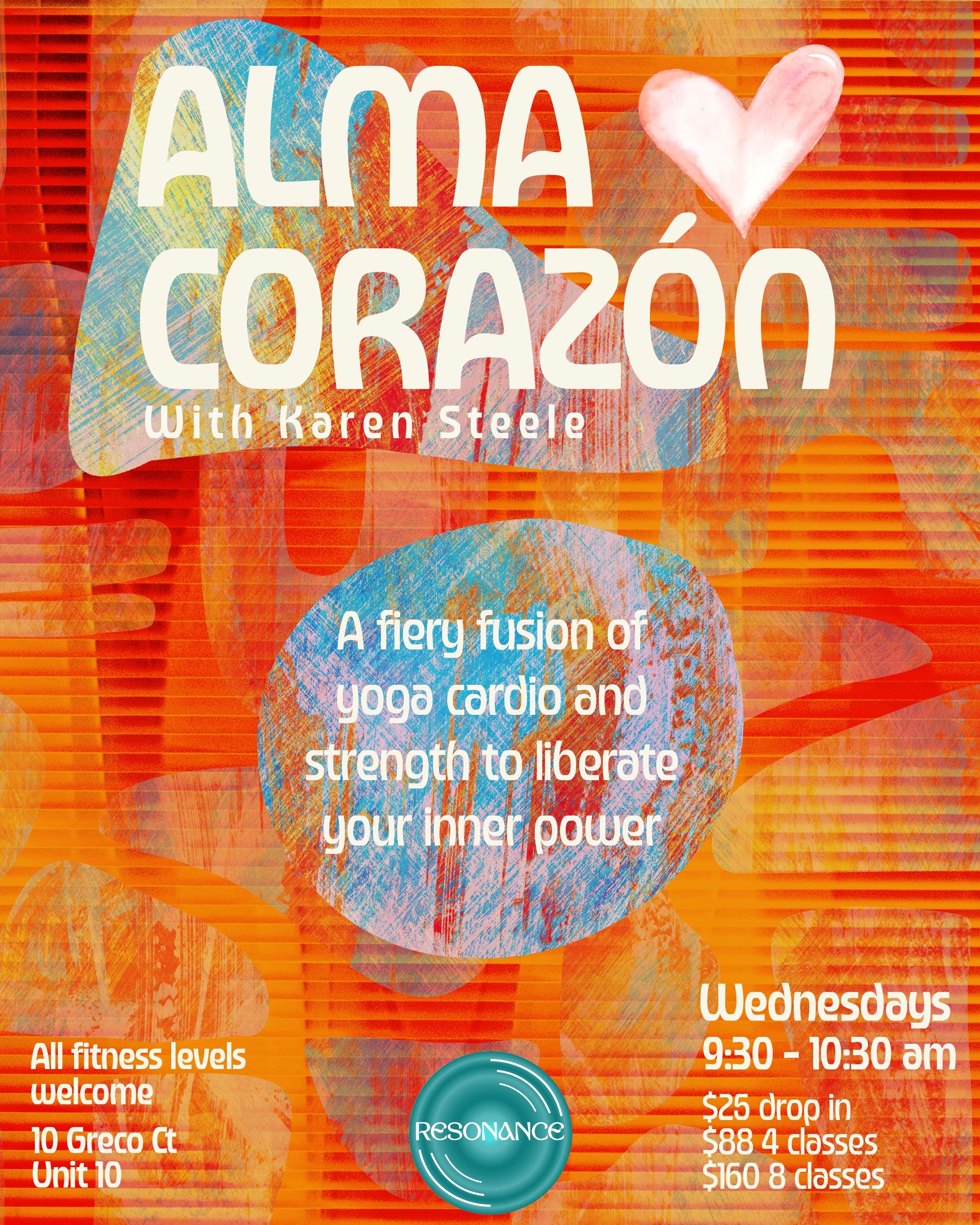 Alma Corazón is a fiery fusion of yoga-inspired sequences, cardiovascular activation, and strength-based practices designed to move energy, unlock stored emotions, and reconnect us to our inner power.
