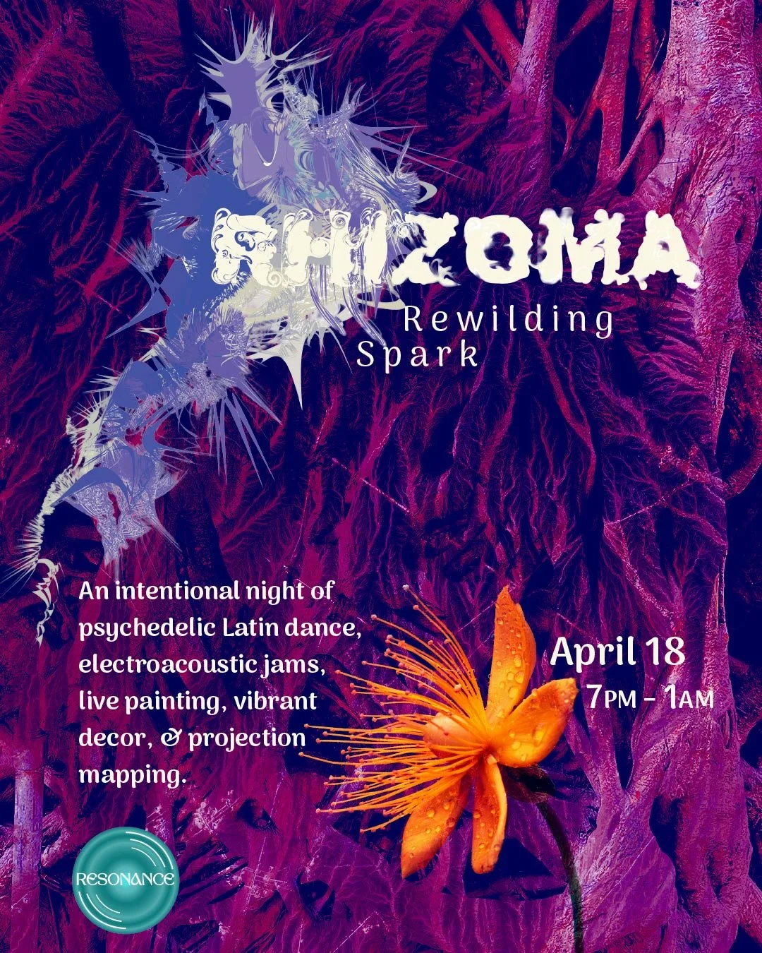 RHIZOMA is a multidisciplinary gathering at the intersection of music, movement, and collective transformation. Rooted in co-creation, every edition mutates organically based on who’s in the space –– weaving together psychedelic Latin dance music, electroacoustic performance, live painting, projection mapping, and immersive decor into one unified evolving ceremony. RHIZOMA invites you to slow down, shed the hustle, and create a portal into altered time + space.