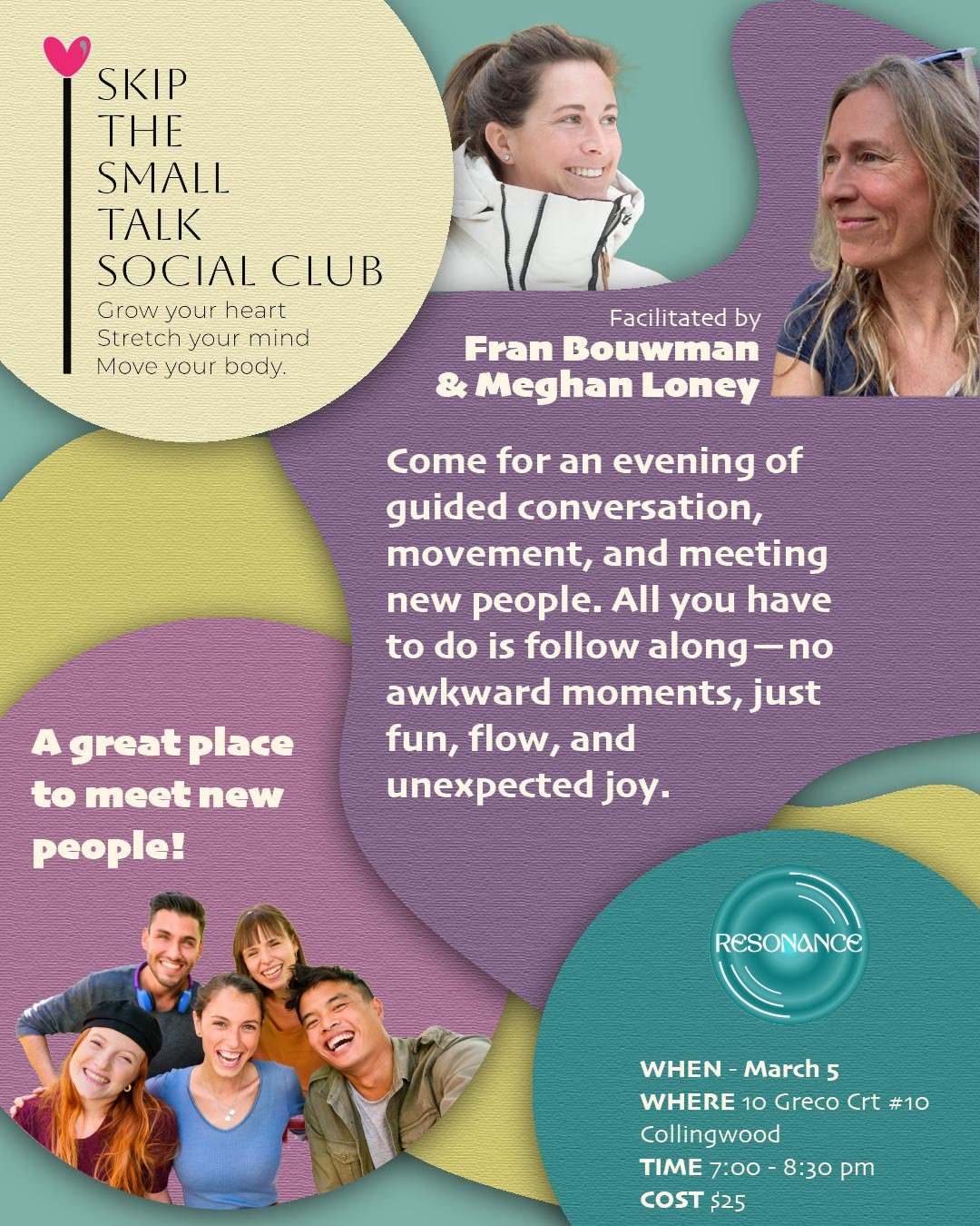 A gathering of curious, open-hearted people exploring the integration of mind, body, heart and spirit through meaningful dialogue, creative expression, embodiment and intentional community. Here you will find friendships that matter, a sense of belonging, and inspiration that lasts. Be led through an experience that’s meaningful. Be seen. Be heard. Be transformed. With facilitators Fran Bouwman and Meghan Loney (price includes HST)