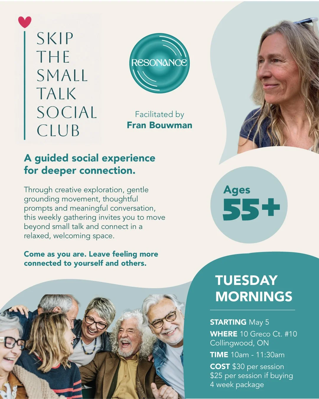 Skip the Small Talk Social Club is a space for real connection — the kind that doesn’t require pretending or performing. Through guided conversation and simple movement, you’ll meet thoughtful, open-hearted people and explore what it feels like to belong. Come as you are. Leave a little more connected.