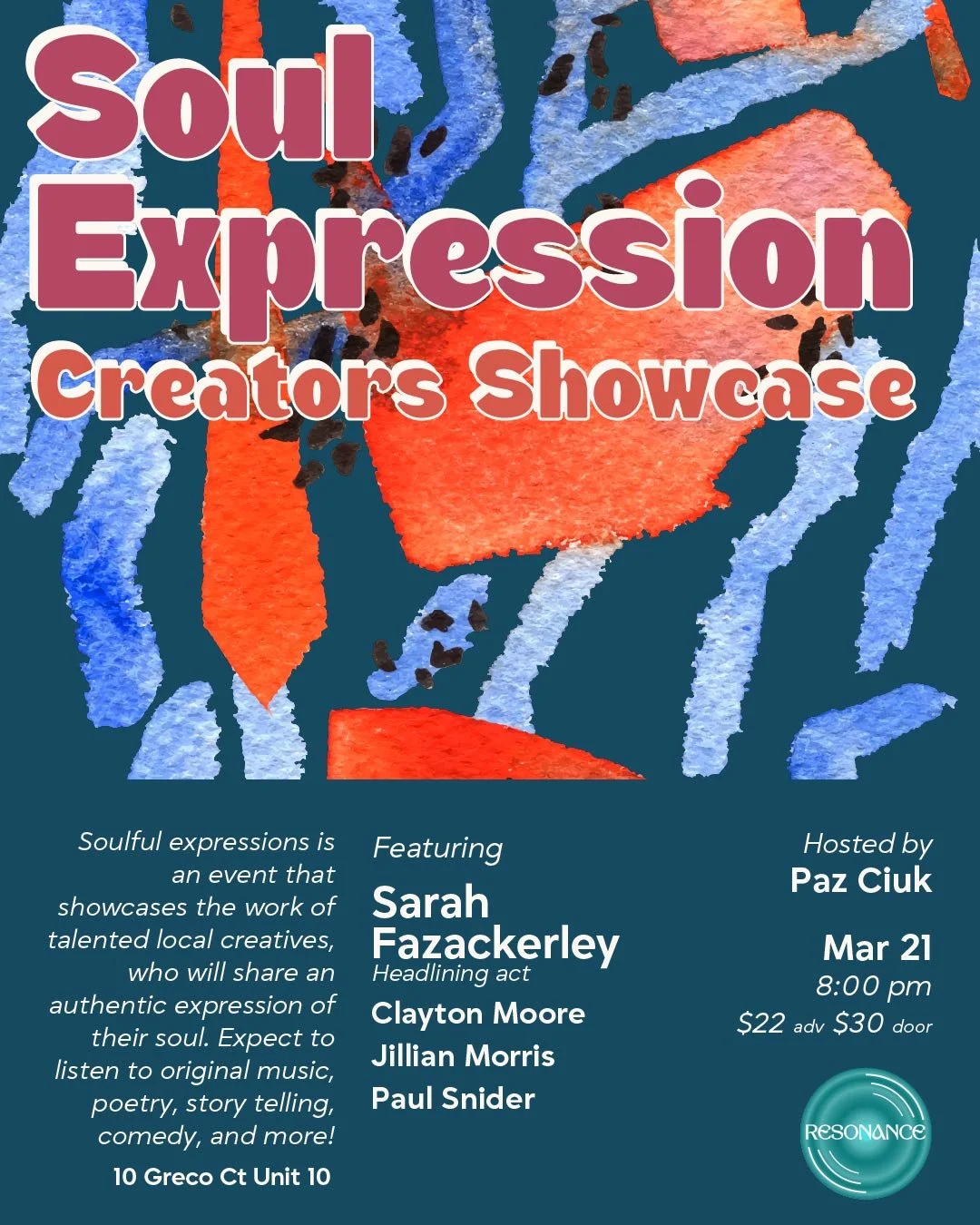 Soul Expression is an event that showcases the work of talented local creatives, who will share an authentic expression of their soul. Expect to listen to original music, poetry, story telling, comedy, and more. Host Paz Ciuk will keep the audience engaged and entertained in between sets. Resonance is a sober, safe and inclusive environment with a delicious drink and snack store. We are looking forward to enjoying another memorable experience with you!